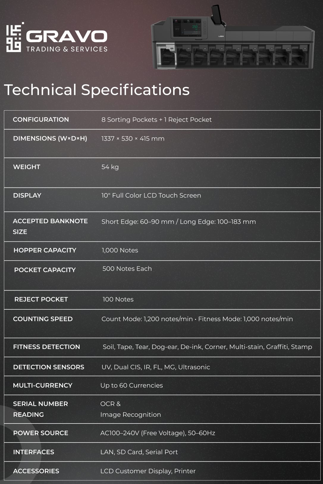 GTS FitScan L9 represents the highest performance in the GTS-Series lineup. Designed for central banks, high-capacity vaults, and CIT facilities, it ensures unmatched accuracy and efficiency with its 8 sorting pockets + 1 reject pocket, powered by a quad-core processor and multi-sensor recognition technology. GTS FitScan L9 enhances productivity, ensures seamless authentication, and simplifies cash management at scale.